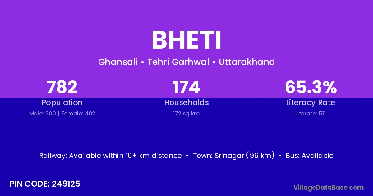 Pauri (42 km) is the nearest town to Bheti village for major economic activities and is located approximately 42 km away.