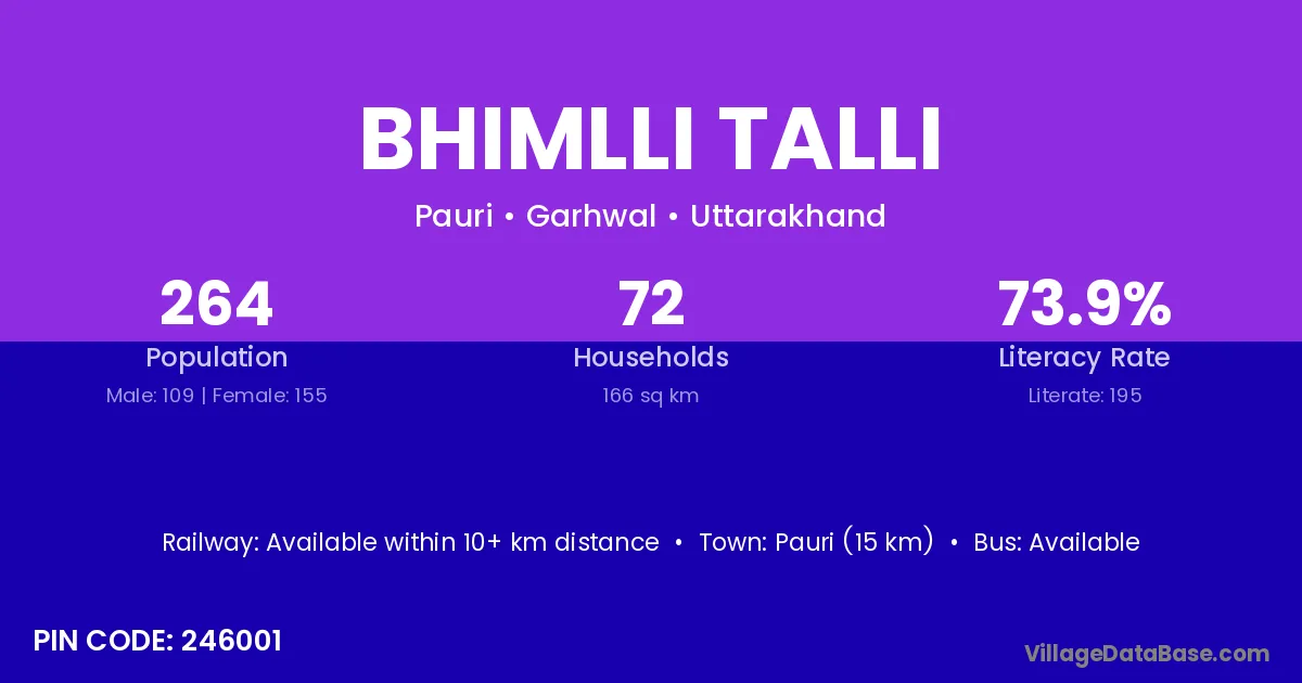 Pauri (15 km) is the nearest town to Bhimlli Talli village for major economic activities and is located approximately 15 km away.