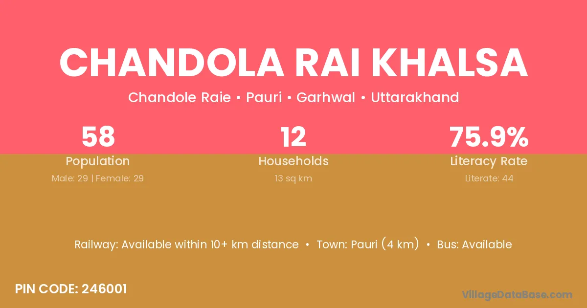Chandola Rai Khalsa village has a total population of 58 people, of which 29 are males and 29 are females.