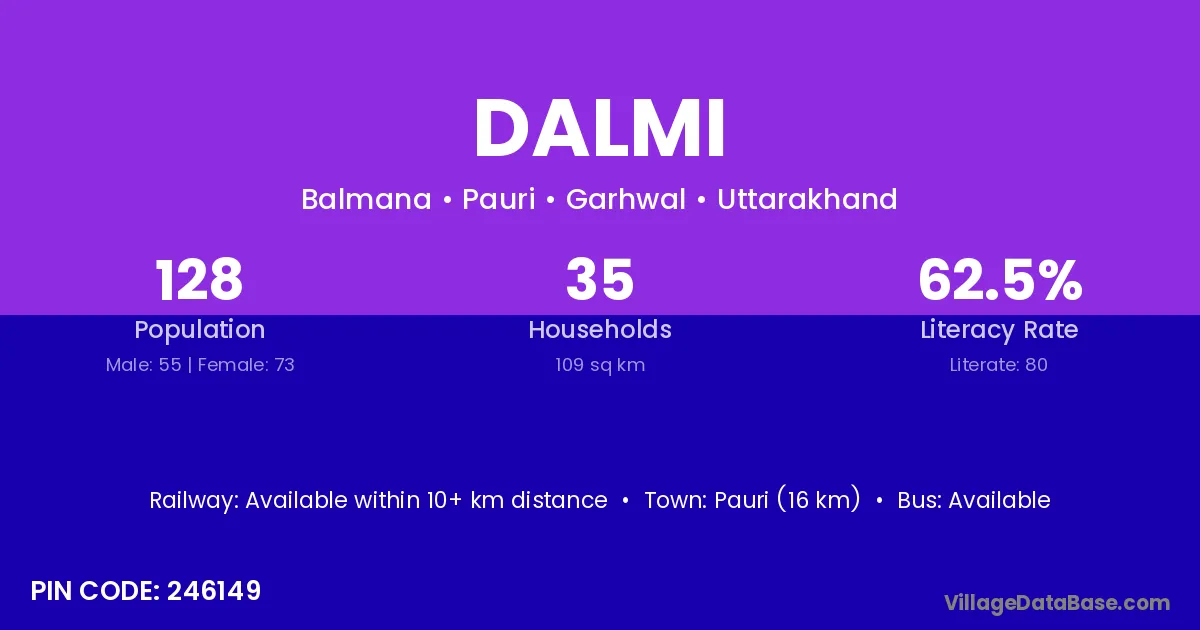 Pauri (16 km) is the nearest town to Dalmi village for major economic activities and is located approximately 16 km away.