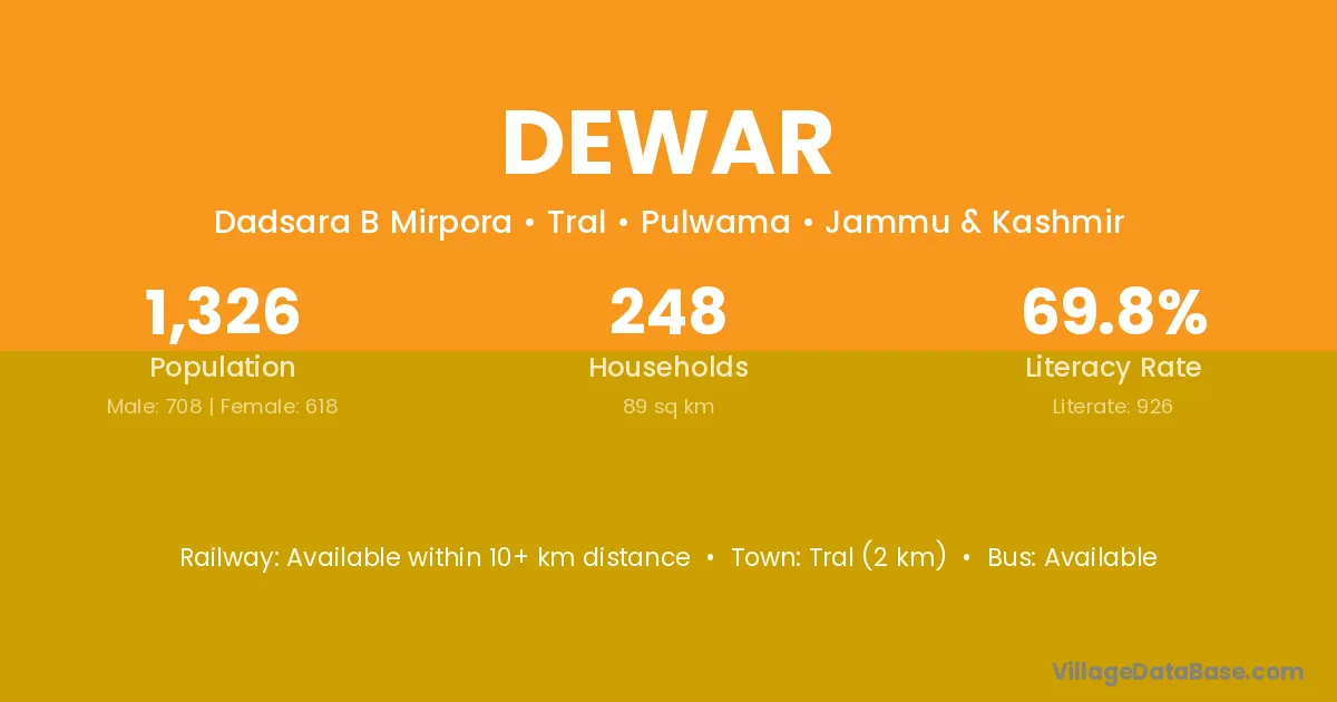 The literacy rate of Dewar village is 69.83%. Male literacy stands at 85.33% and female literacy at 58.65%.