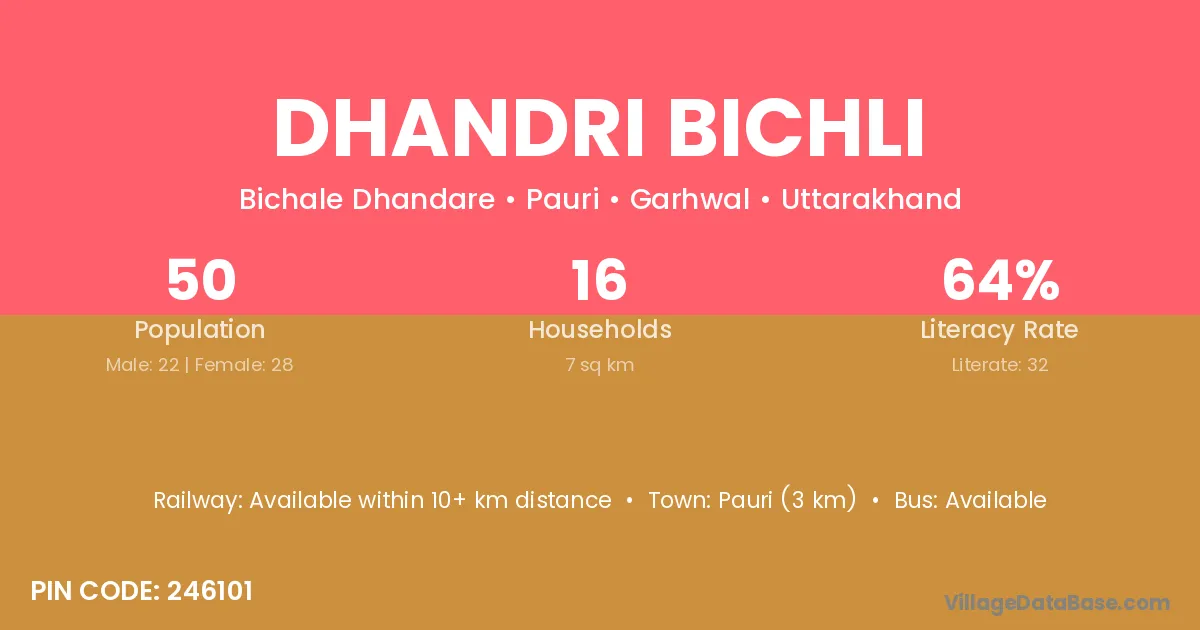 Pauri (3 km) is the nearest town to Dhandri Bichli village for major economic activities and is located approximately 3 km away.
