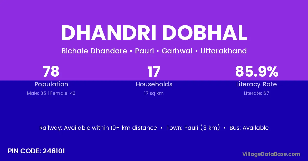 Dhandri Dobhal village has a total population of 78 people, of which 35 are males and 43 are females.