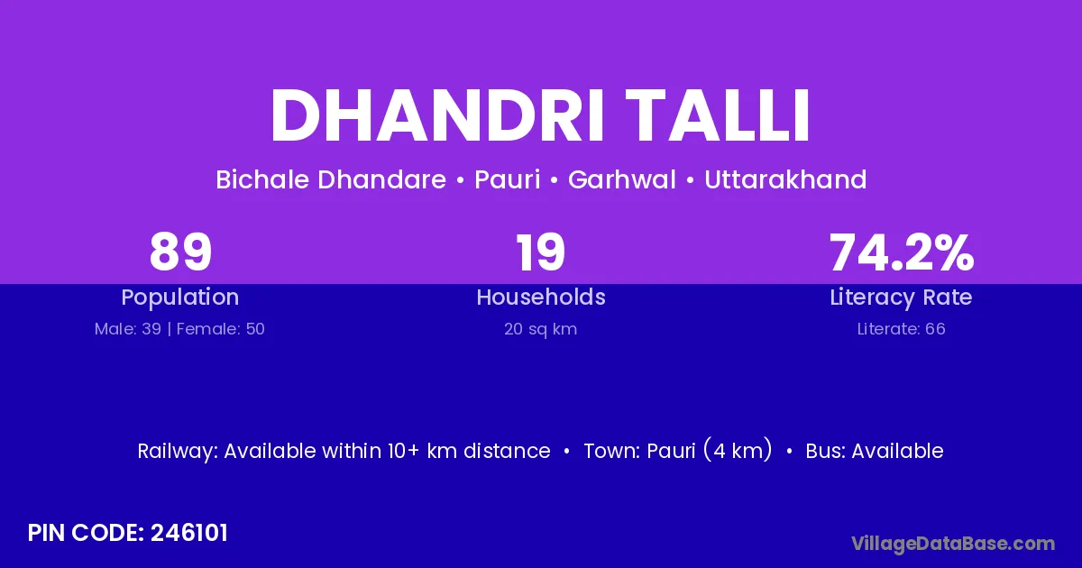Pauri (4 km) is the nearest town to Dhandri Talli village for major economic activities and is located approximately 4 km away.