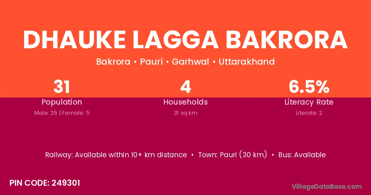 Pauri (30 km) is the nearest town to Dhauke Lagga Bakrora village for major economic activities and is located approximately 30 km away.