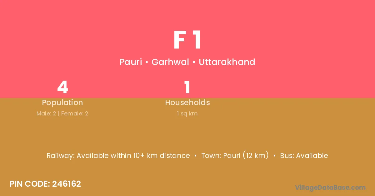 Pauri (12 km) is the nearest town to F 1 village for major economic activities and is located approximately 12 km away.