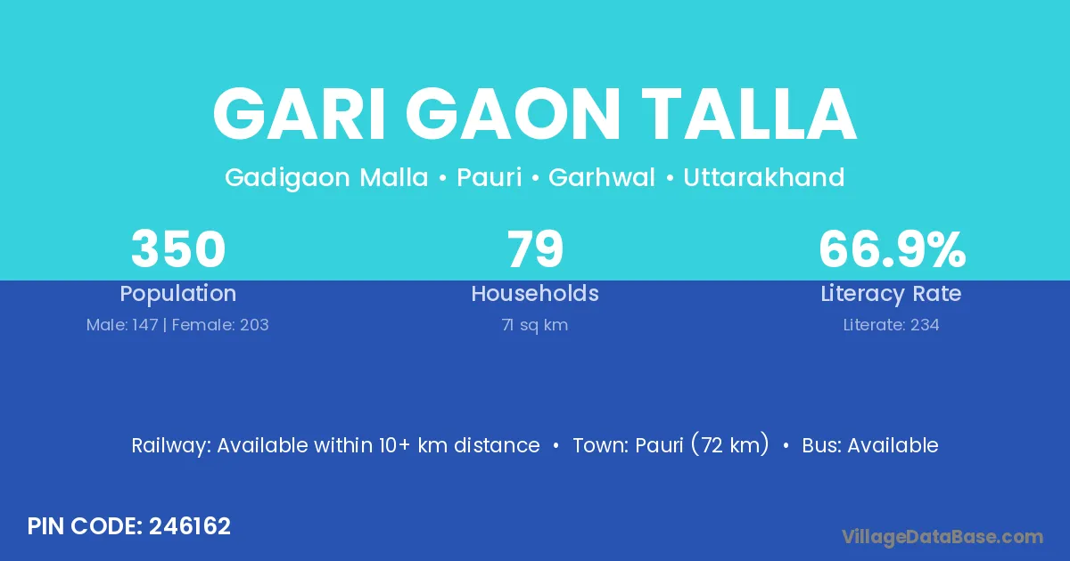 Gari Gaon Talla village has a total population of 350 people, of which 147 are males and 203 are females.