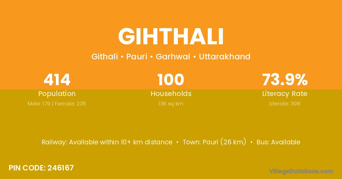 Pauri (26 km) is the nearest town to Gihthali village for major economic activities and is located approximately 26 km away.