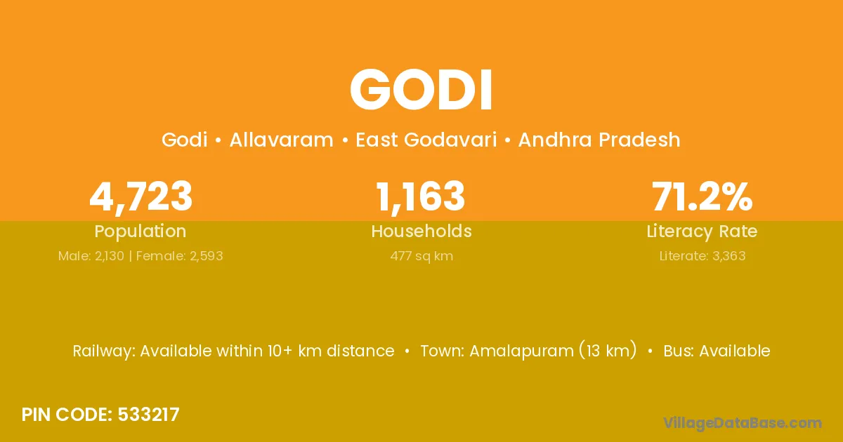 The literacy rate of Godi village is 52.94%. Male literacy stands at 69.23% and female literacy at 42.86%.