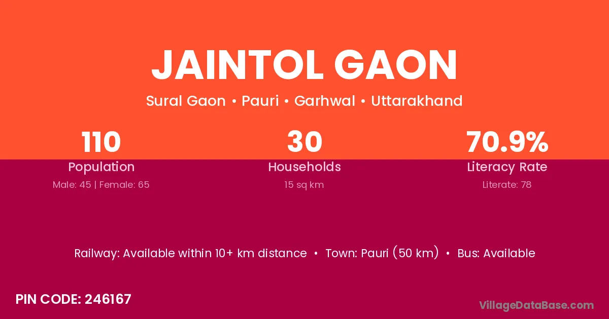 Pauri (50 km) is the nearest town to Jaintol Gaon village for major economic activities and is located approximately 50 km away.