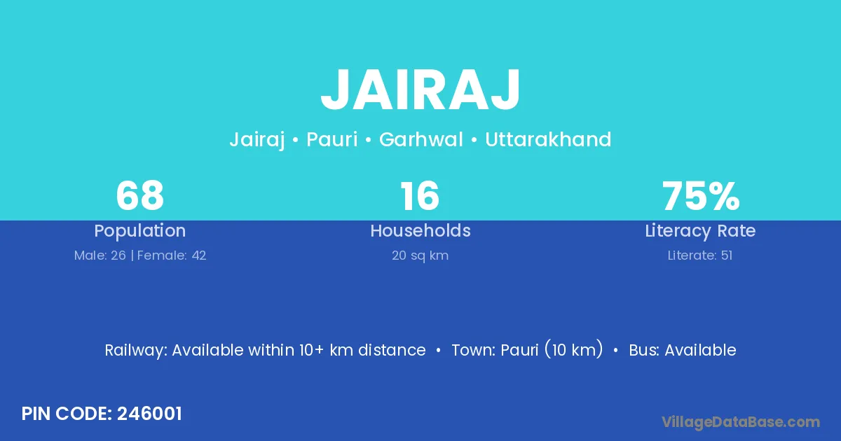 Pauri (10 km) is the nearest town to Jairaj village for major economic activities and is located approximately 10 km away.