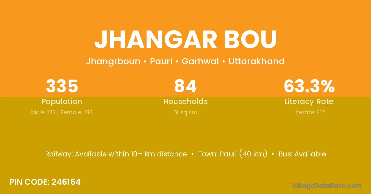 Pauri (40 km) is the nearest town to Jhangar Bou village for major economic activities and is located approximately 40 km away.