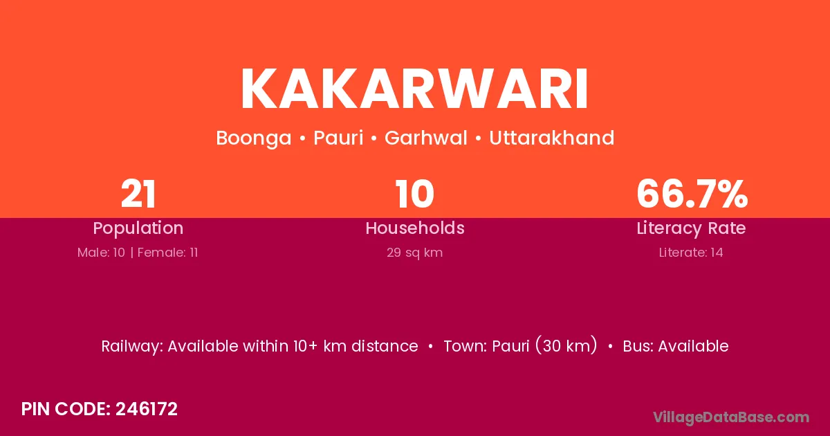 Pauri (30 km) is the nearest town to Kakarwari village for major economic activities and is located approximately 30 km away.
