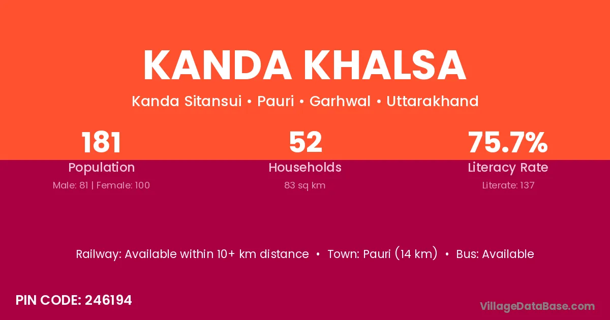 Pauri (14 km) is the nearest town to Kanda Khalsa village for major economic activities and is located approximately 14 km away.