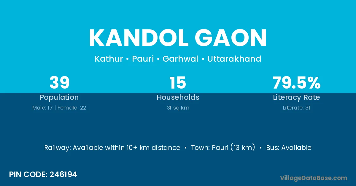 Pauri (13 km) is the nearest town to Kandol Gaon village for major economic activities and is located approximately 13 km away.