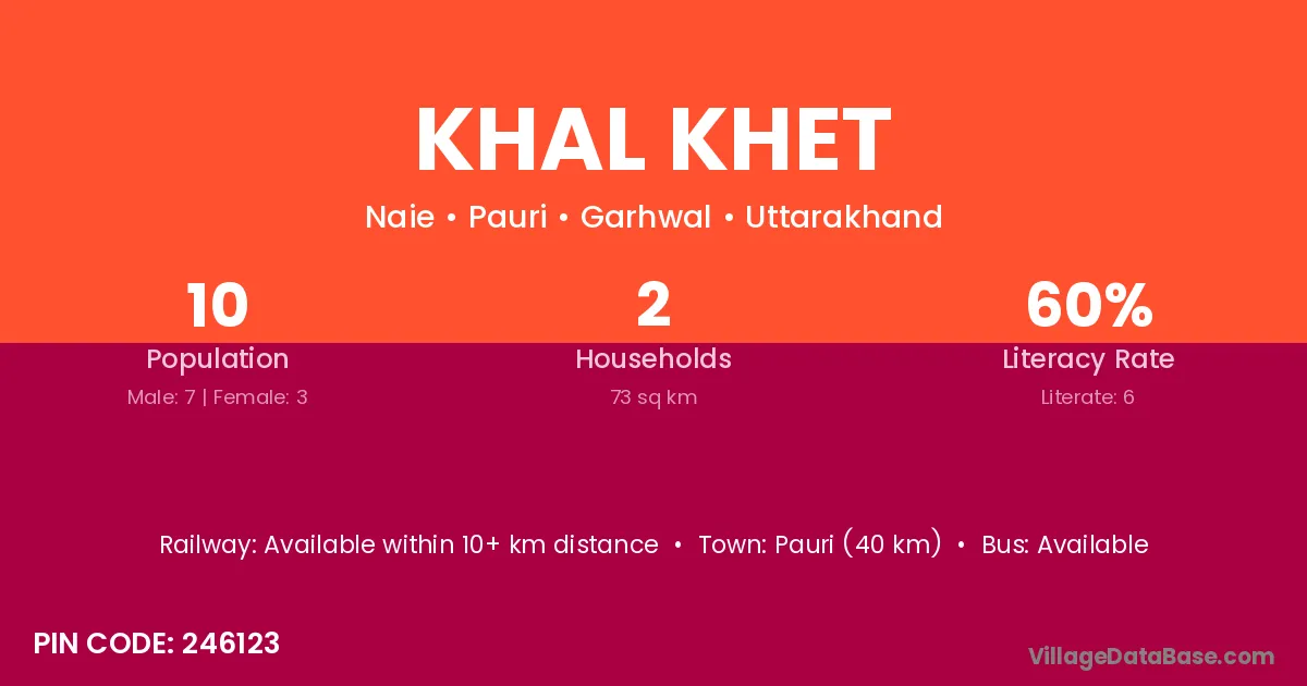 Pauri (40 km) is the nearest town to Khal Khet village for major economic activities and is located approximately 40 km away.