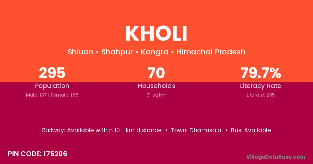 The literacy rate of Kholi village is 60.87%. Male literacy stands at 66.67% and female literacy at 50.00%.