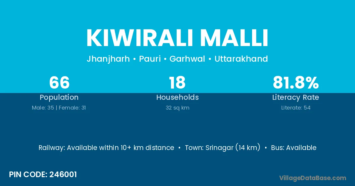 Kiwirali Malli village has a total population of 66 people, of which 35 are males and 31 are females.