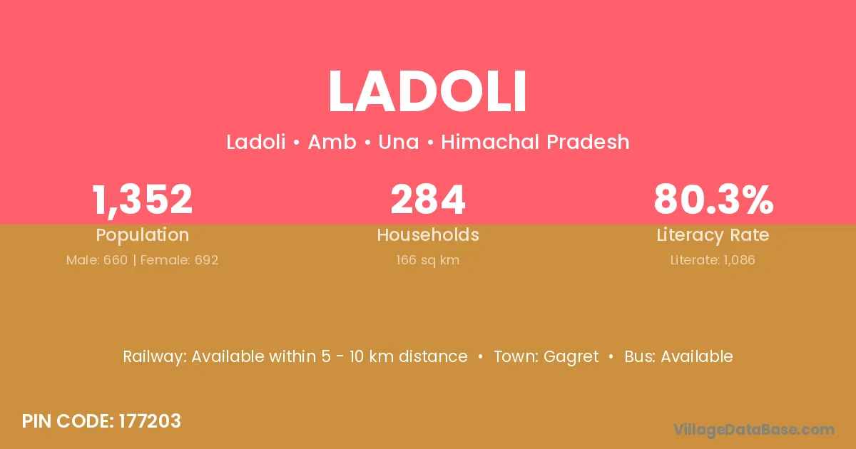 Ladoli village has a total population of 12 people, of which 6 are males and 6 are females.