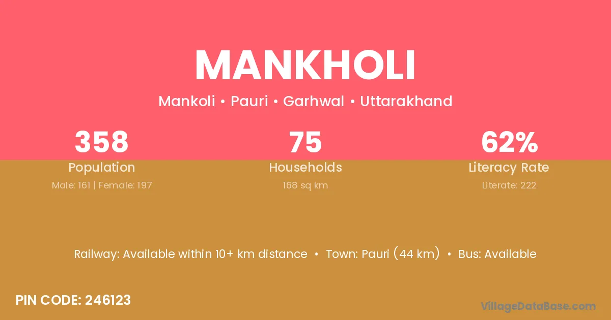 Pauri (44 km) is the nearest town to Mankholi village for major economic activities and is located approximately 44 km away.