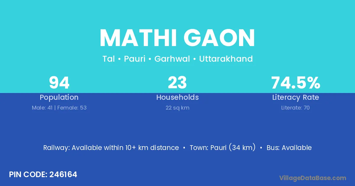 Pauri (34 km) is the nearest town to Mathi Gaon village for major economic activities and is located approximately 34 km away.