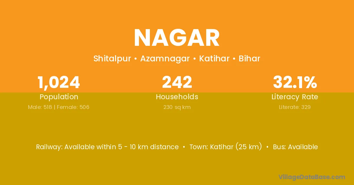 The literacy rate of Nagar village is 73.35%. Male literacy stands at 81.56% and female literacy at 66.96%.