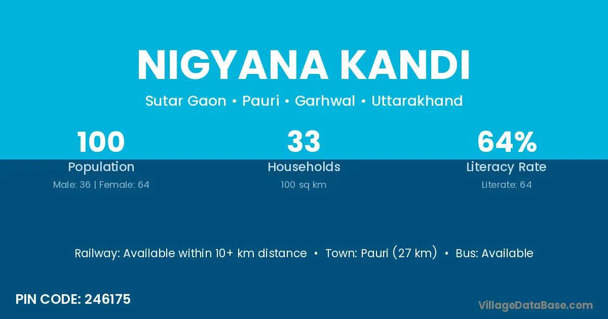 Pauri (27 km) is the nearest town to Nigyana Kandi village for major economic activities and is located approximately 27 km away.