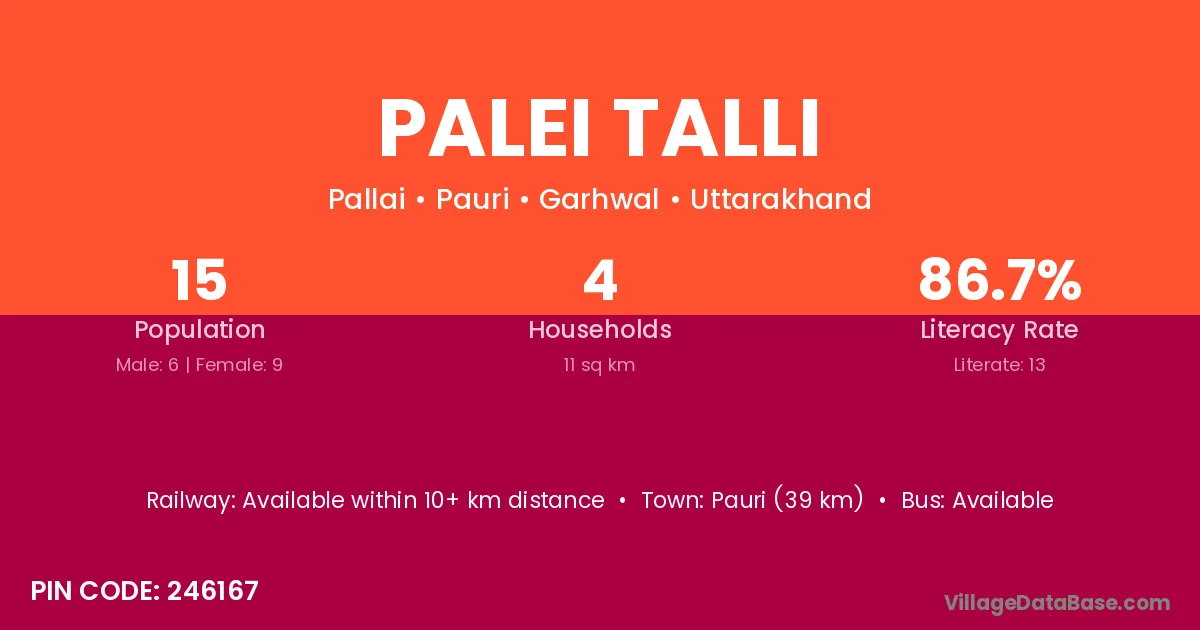 Pauri (39 km) is the nearest town to Palei Talli village for major economic activities and is located approximately 39 km away.