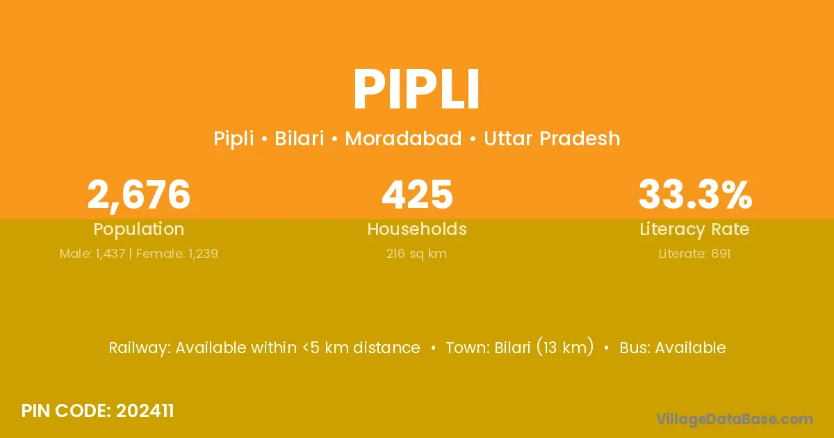 The literacy rate of Pipli village is 62.82%. Male literacy stands at 70.27% and female literacy at 56.10%.