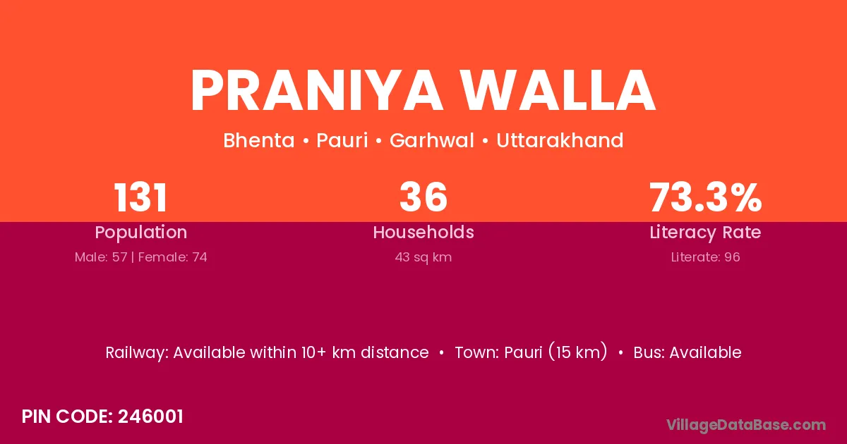 Pauri (15 km) is the nearest town to Praniya Walla village for major economic activities and is located approximately 15 km away.