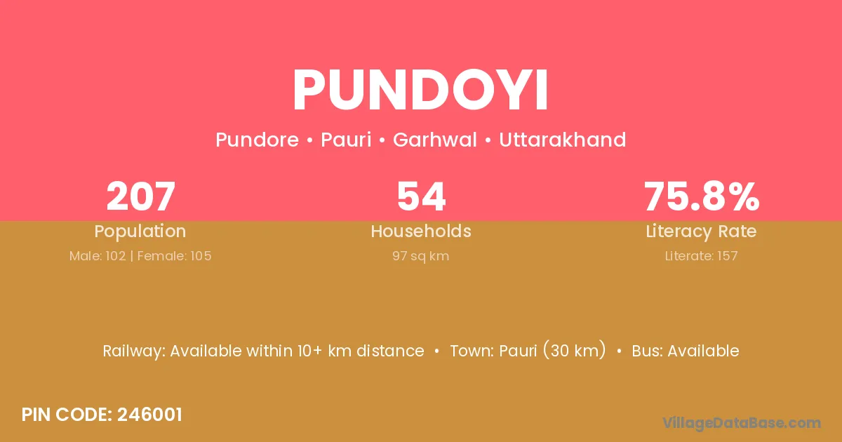 Pundoyi village has a total population of 207 people, of which 102 are males and 105 are females.