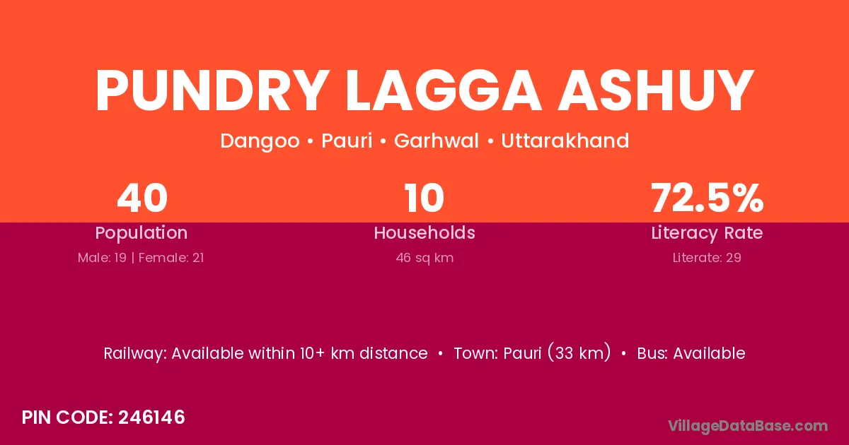 Pauri (33 km) is the nearest town to Pundry Lagga Ashuy village for major economic activities and is located approximately 33 km away.