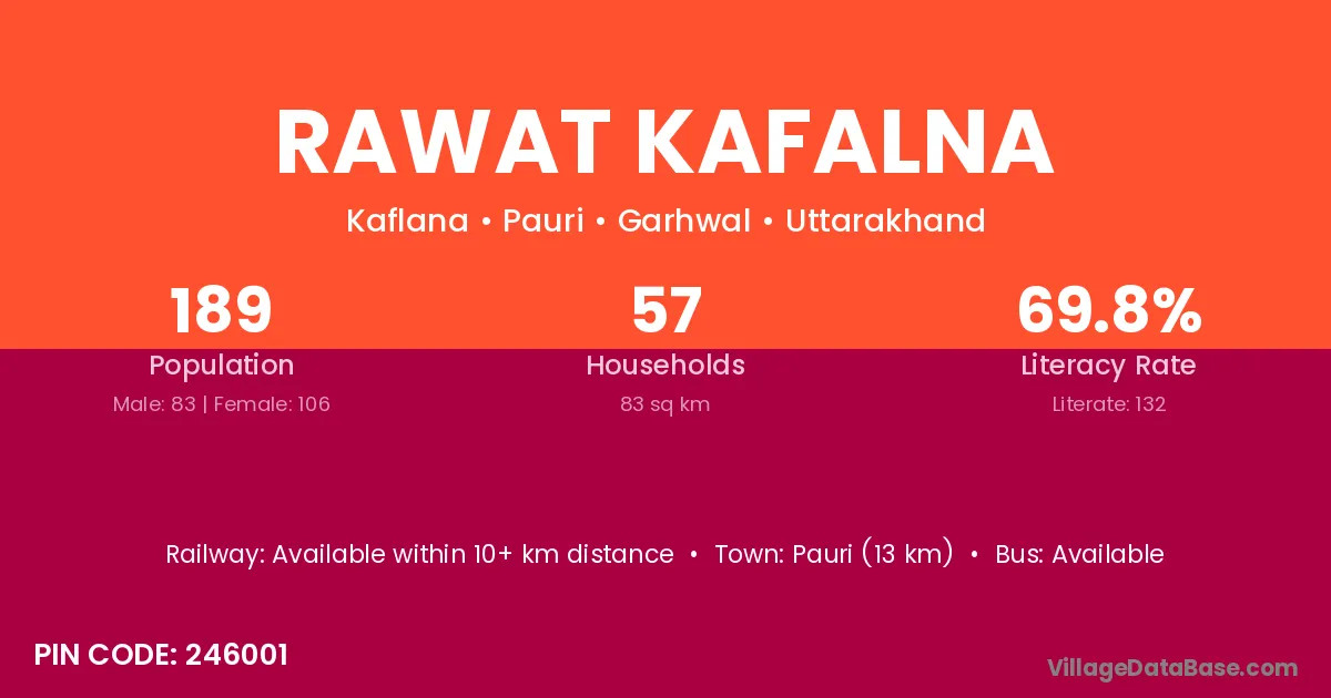 Rawat Kafalna village has a total population of 189 people, of which 83 are males and 106 are females.