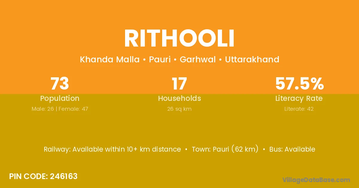 Pauri (62 km) is the nearest town to Rithooli village for major economic activities and is located approximately 62 km away.