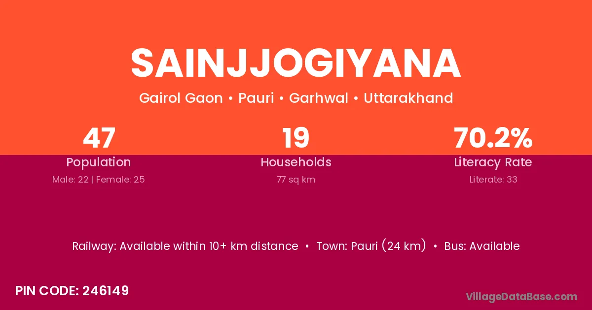 Pauri (24 km) is the nearest town to Sainjjogiyana village for major economic activities and is located approximately 24 km away.