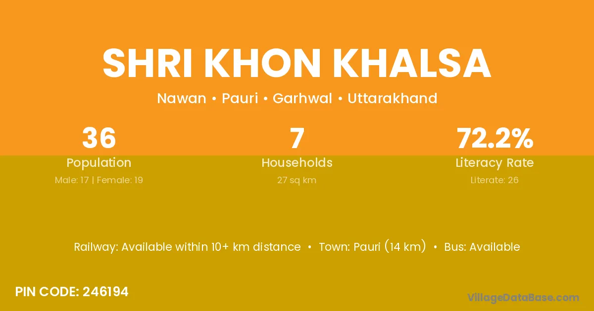 Pauri (14 km) is the nearest town to Shri Khon Khalsa village for major economic activities and is located approximately 14 km away.