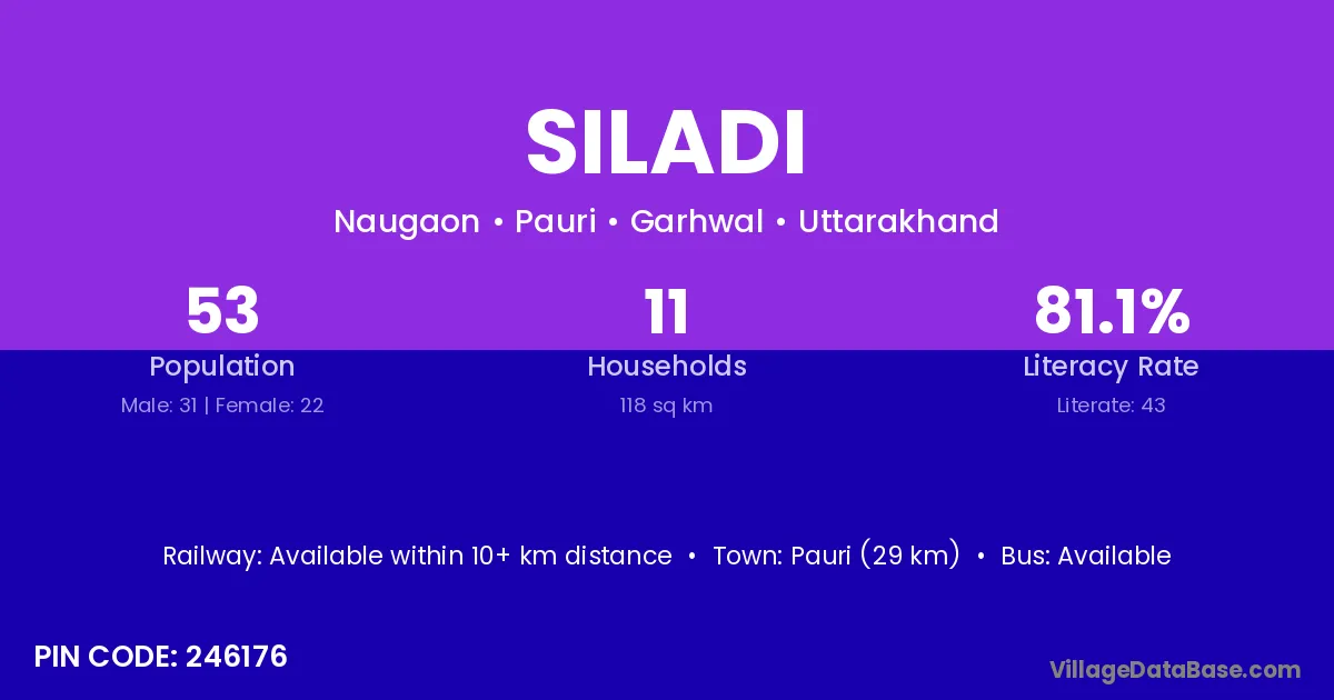 Pauri (29 km) is the nearest town to Siladi village for major economic activities and is located approximately 29 km away.