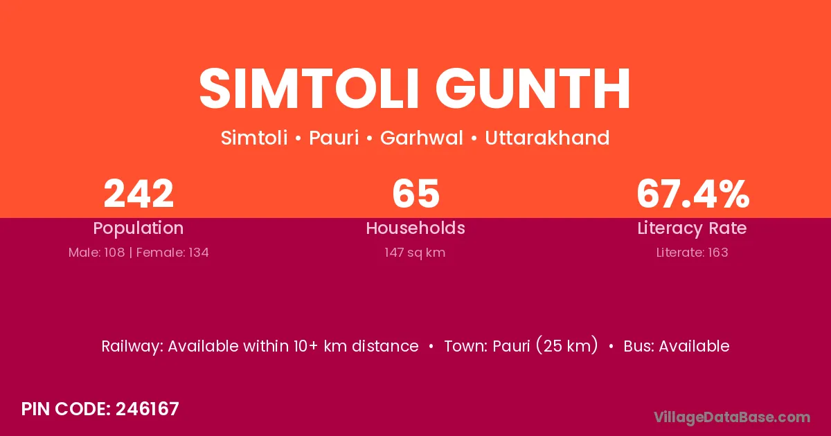 Pauri (25 km) is the nearest town to Simtoli Gunth village for major economic activities and is located approximately 25 km away.