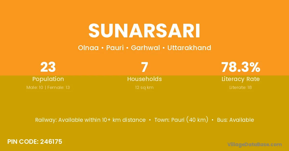 Pauri (40 km) is the nearest town to Sunarsari village for major economic activities and is located approximately 40 km away.