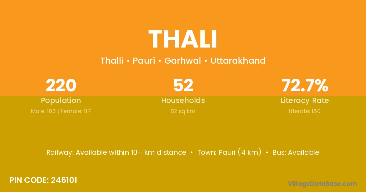 Pauri (4 km) is the nearest town to Thali village for major economic activities and is located approximately 4 km away.