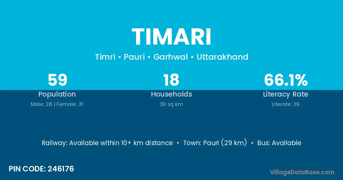 Pauri (29 km) is the nearest town to Timari village for major economic activities and is located approximately 29 km away.