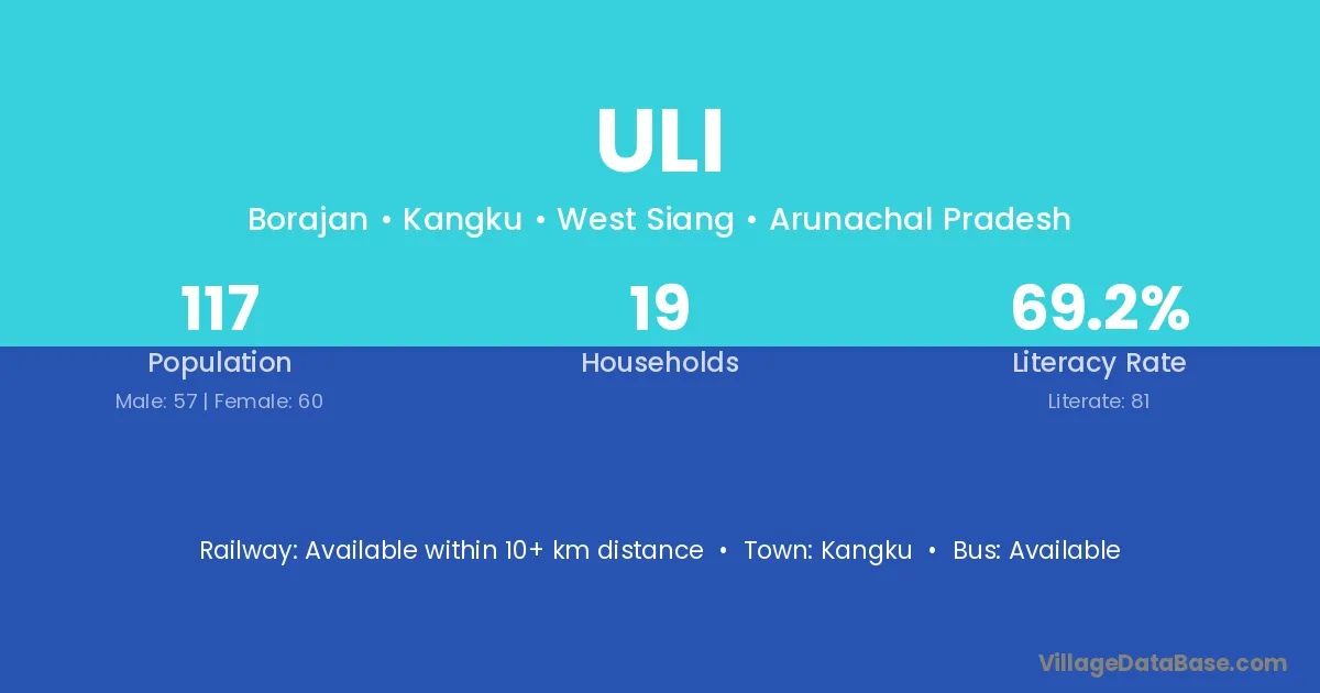 The literacy rate of Uli village is 71.19%. Male literacy stands at 83.75% and female literacy at 60.37%.