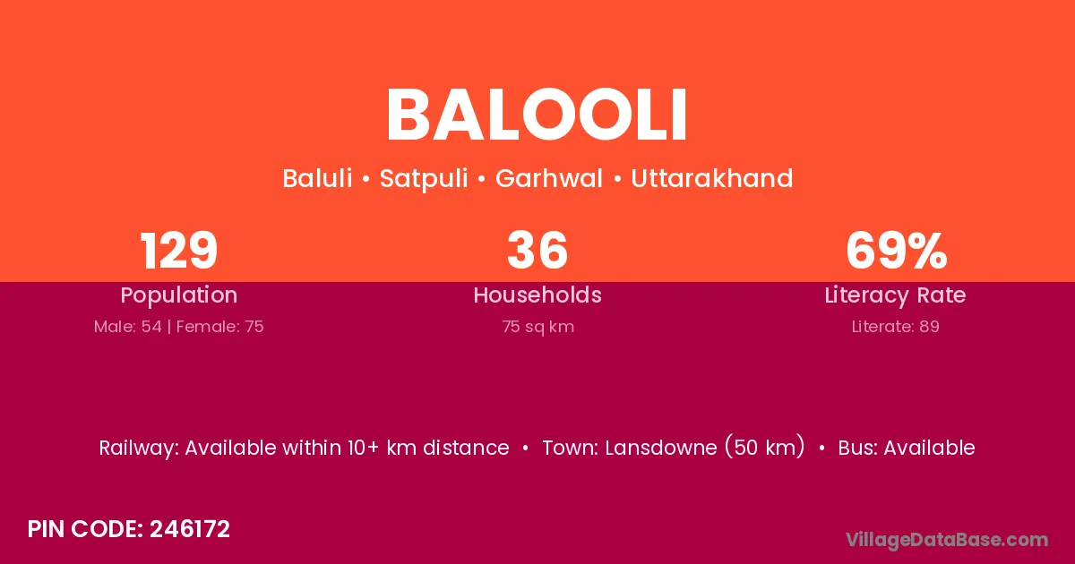 Lansdowne (50 km) is the nearest town to Balooli village for major economic activities and is located approximately 50 km away.