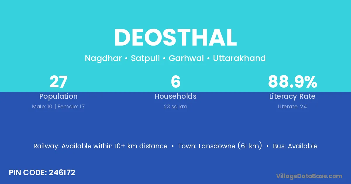 Lansdowne (61 km) is the nearest town to Deosthal village for major economic activities and is located approximately 61 km away.