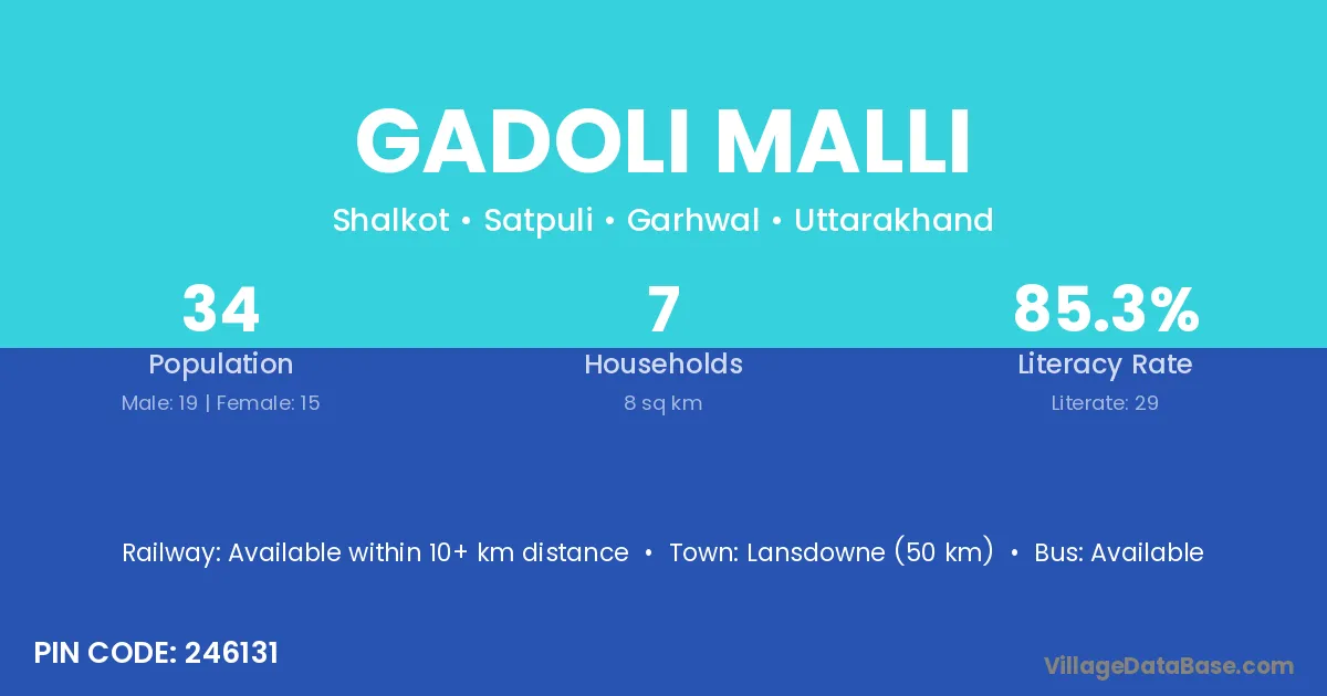 Lansdowne (50 km) is the nearest town to Gadoli Malli village for major economic activities and is located approximately 50 km away.