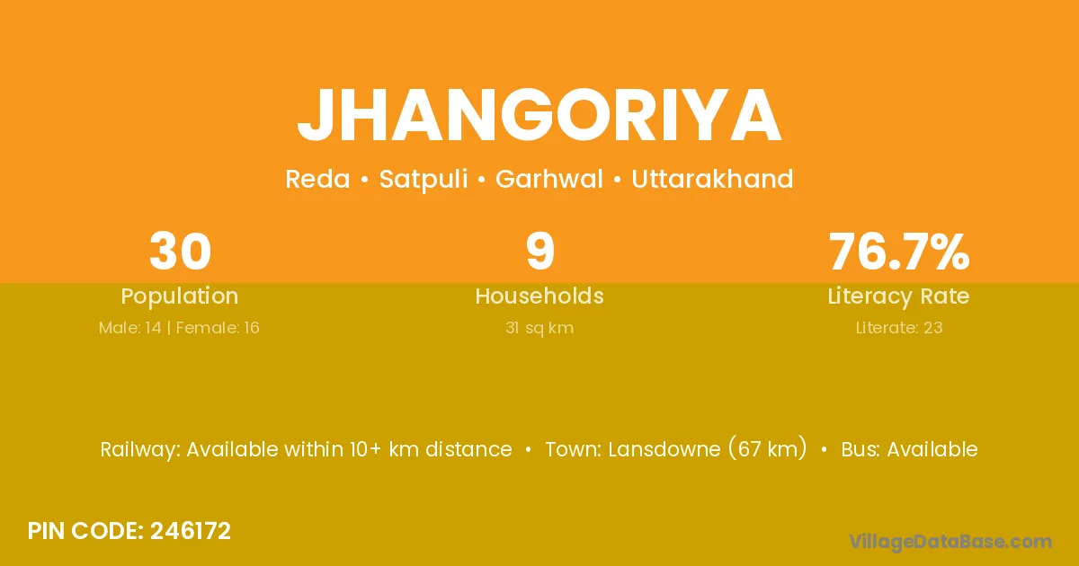 Lansdowne (67 km) is the nearest town to Jhangoriya village for major economic activities and is located approximately 67 km away.