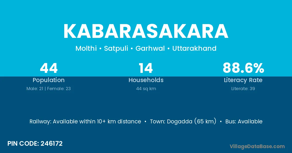 Dogadda (65 km) is the nearest town to Kabarasakara village for major economic activities and is located approximately 65 km away.