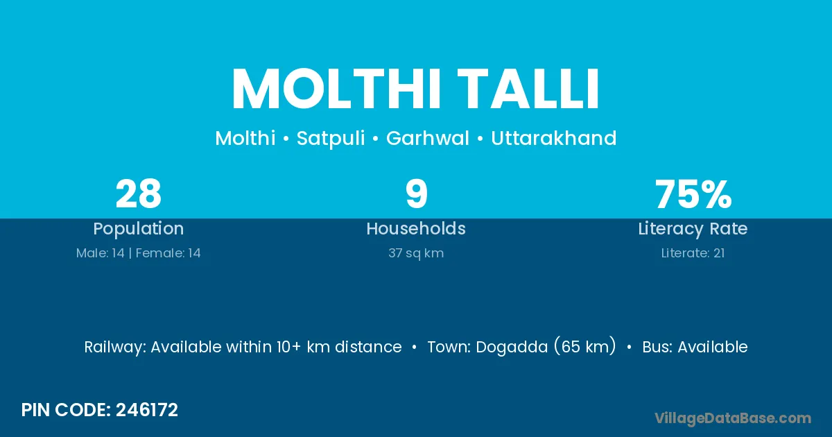 Dogadda (65 km) is the nearest town to Molthi Talli village for major economic activities and is located approximately 65 km away.