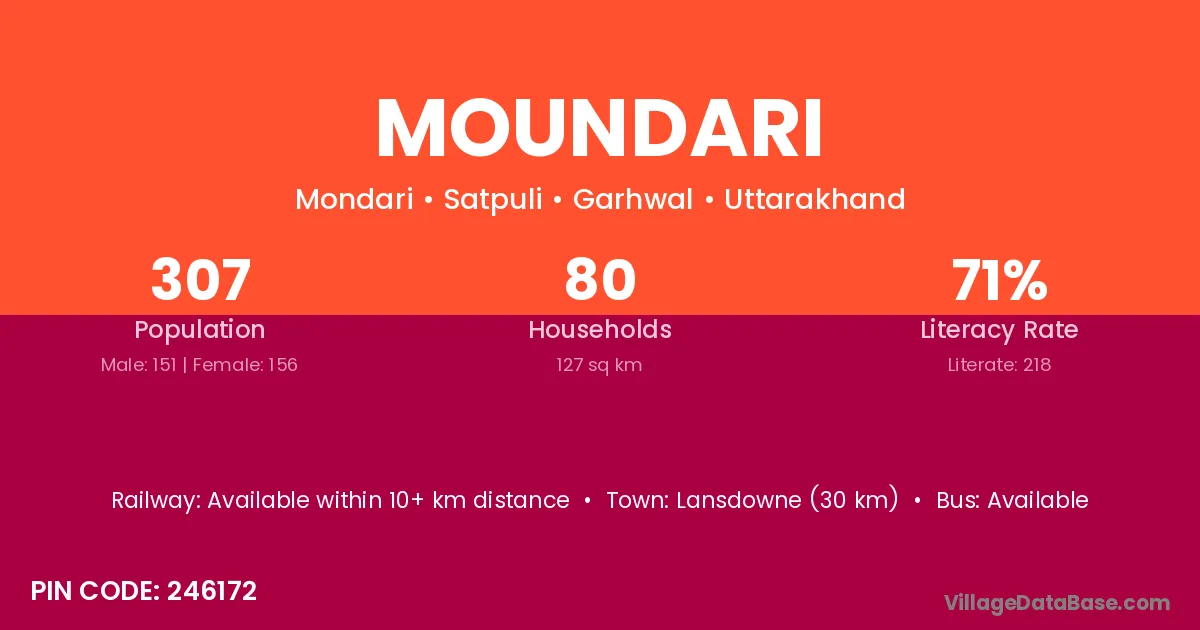 Lansdowne (30 km) is the nearest town to Moundari village for major economic activities and is located approximately 30 km away.