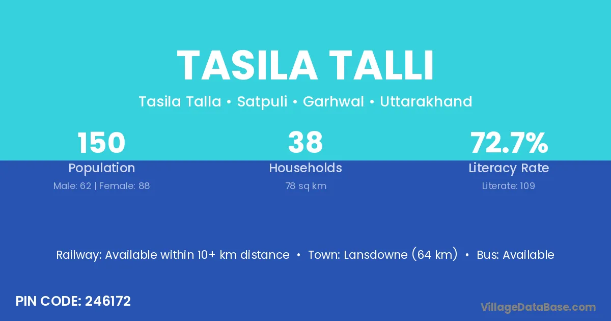 Lansdowne (64 km) is the nearest town to Tasila Talli village for major economic activities and is located approximately 64 km away.
